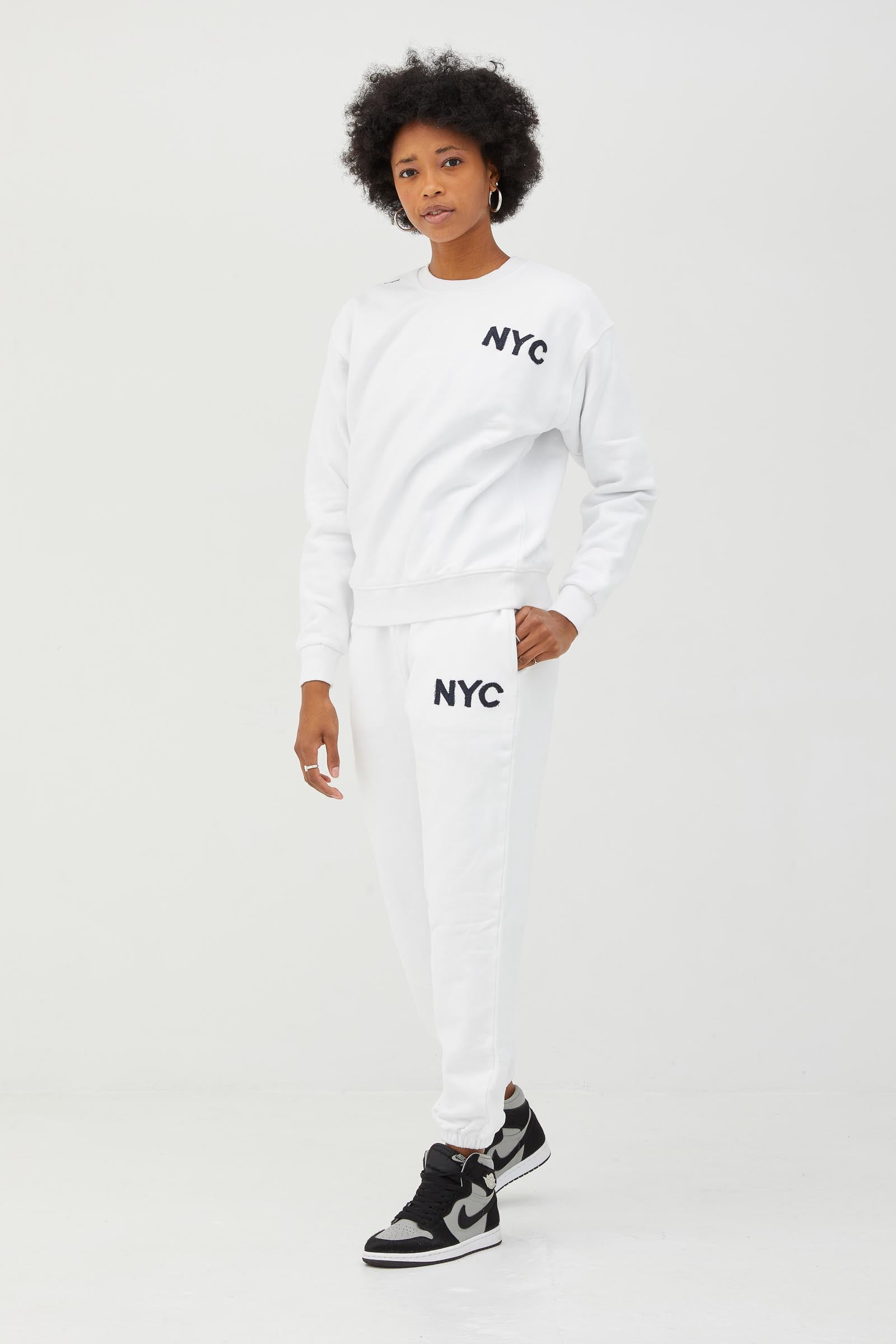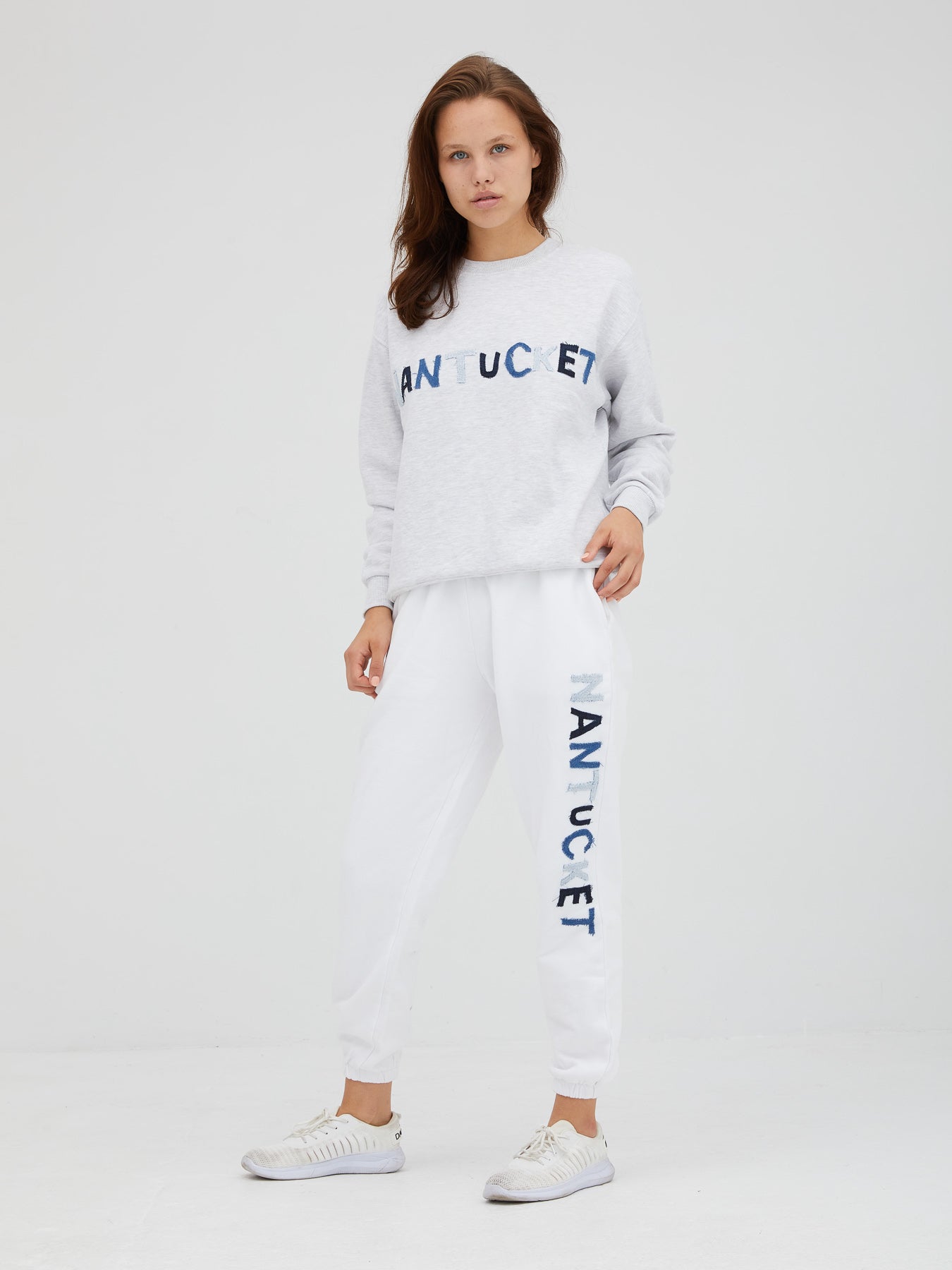 Design your own cozy unisex sweatpants with different letter denim appliqué patches. Made to order and hand embellished in California.